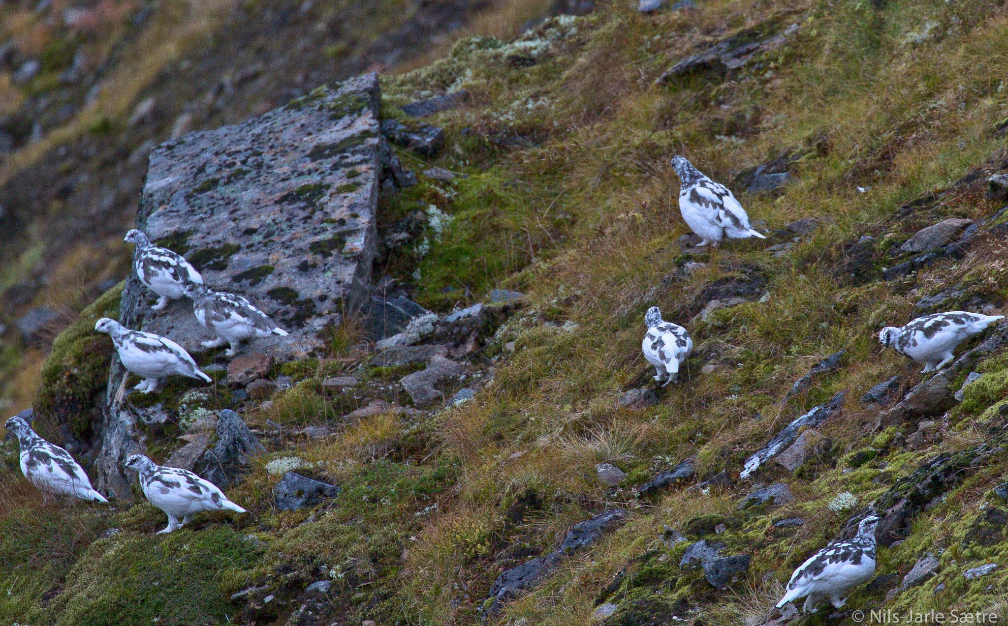 Så hørte jeg noen lyder. Hva var det der? Jeg tok et par skritt til venstre og så over kanten. Ni ryper i vinterdrakt. Men de var litt for langt unna til at jeg fikk de virkelig gode nærbildene. Det var bare en ting å gjøre. Så jeg krøp over kanten og snek meg nærmere langs fjellsiden, men før jeg kom nær nok, fløy de selvsagt raskt av sted.