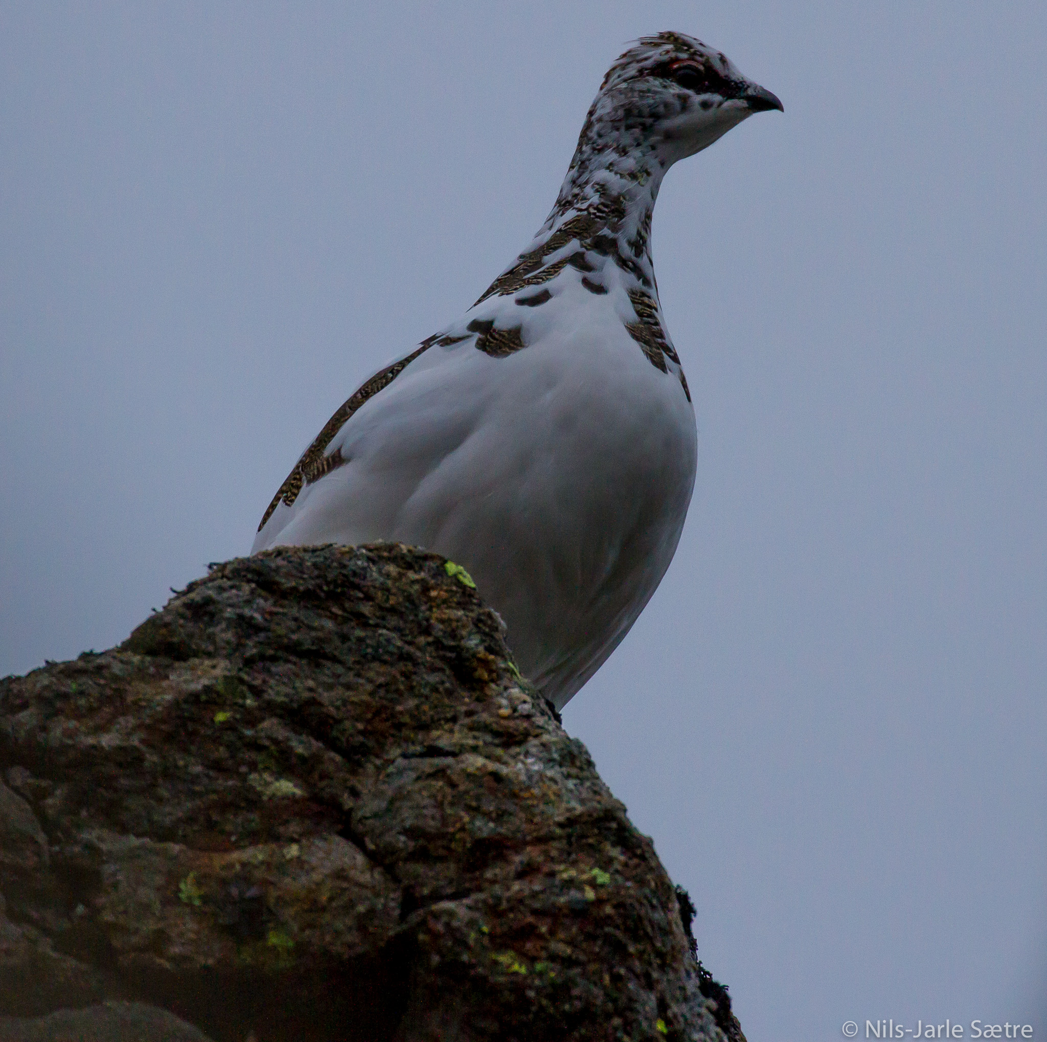 Jeg bevegde meg mot toppen. De siste tre meterne må en klyve til topps. Jeg la fotostativet oppå toppen, for å komme meg lettere opp. Så snudde jeg hodet til høyre før jeg skulle ned og hente kamerabagen. Og så rett på to ryper fire meter fra meg. En herlig overraskelse, for jeg var så sikker på at jeg hadde laget så mye lyd at de hadde stukket fra toppen.