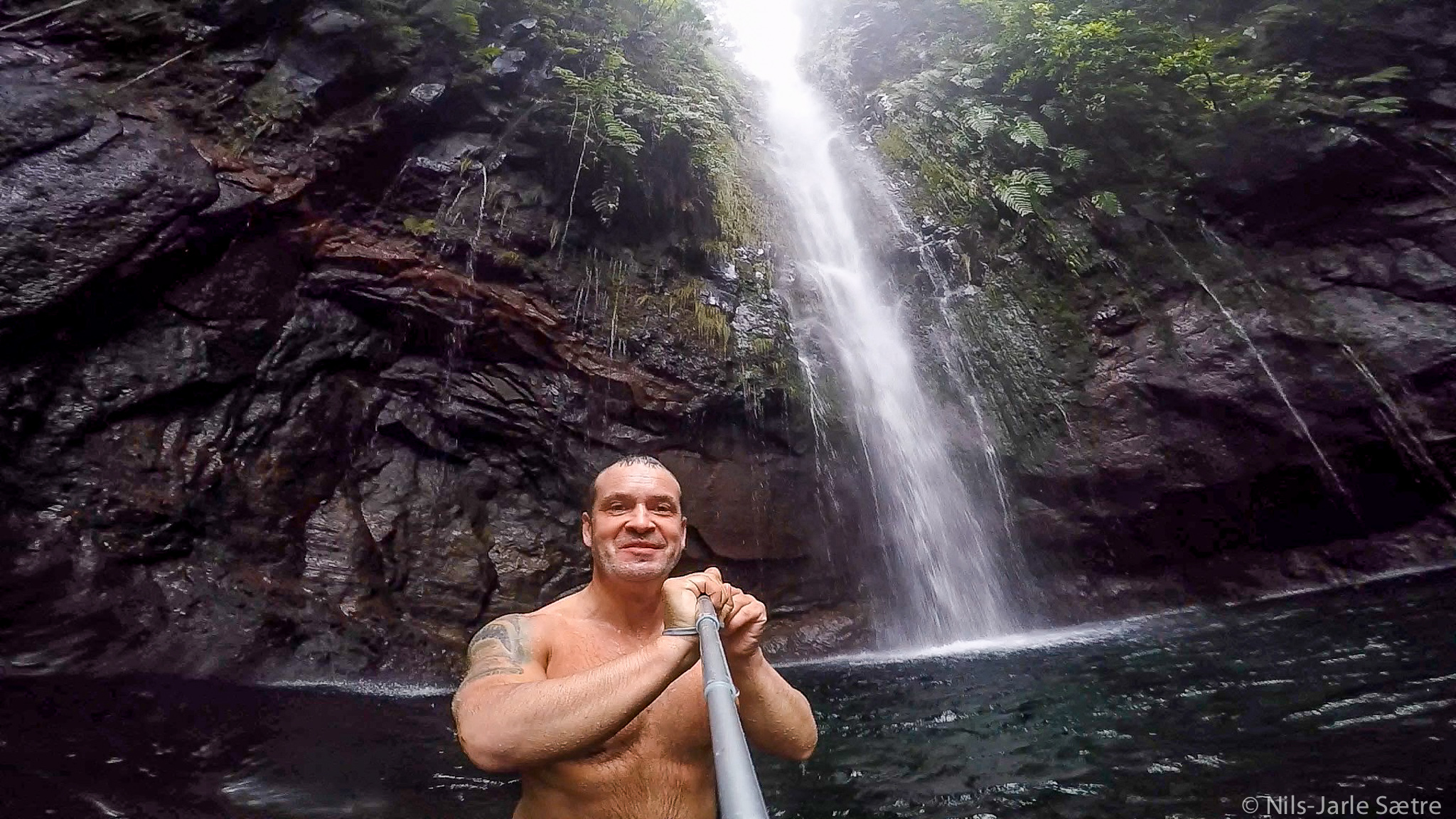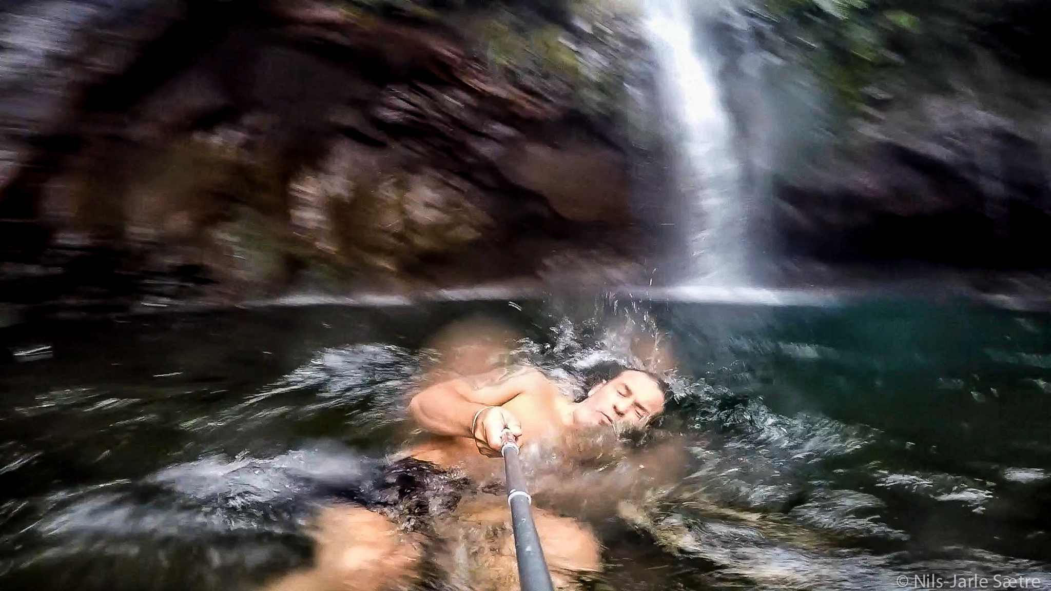 Da var det fritt frem for stripping, og like etter sto jeg i nettoen. Det var ikke akkurat behagelig å kle seg naken i regnet, men det var ingen vei tilbake, for jeg hadde bestemt meg for å bade. Shortsen kom på og så var det bare å spasere bort til fossefallet.