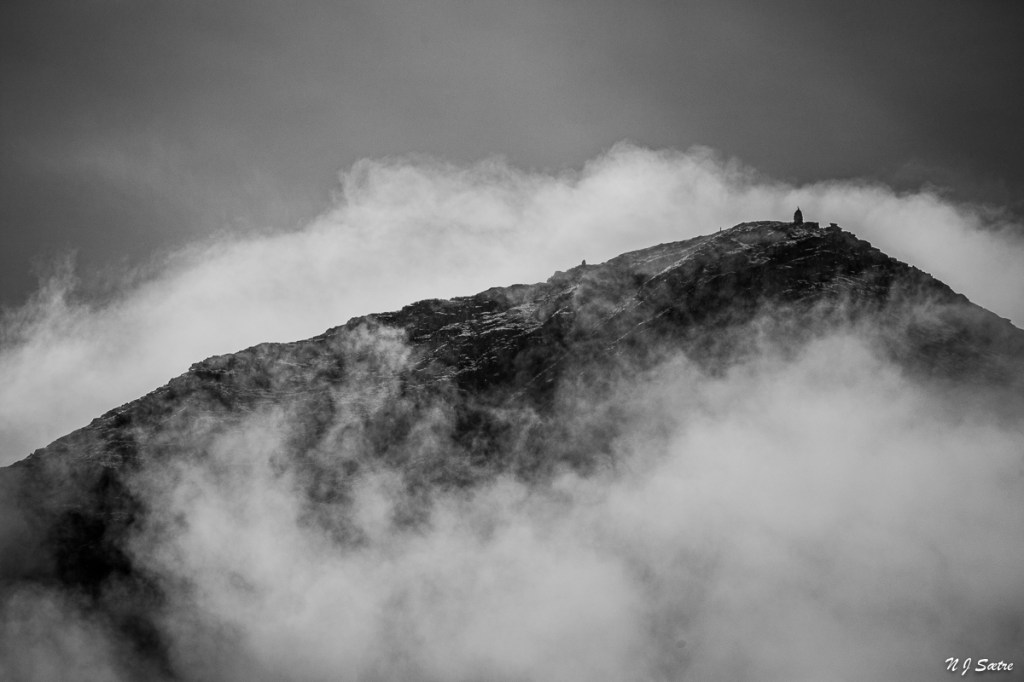 40 minutter senere kom en ny smell, da jeg trodde jeg skulle få se Bergehornet igjen. Skodda lå, om mulig, enda tettere rundt toppen fra om lag 800 meters høyde. Den var nesten som skodda hadde fått seg ny kjæreste og nektet å gi slipp på omfavnelsen.