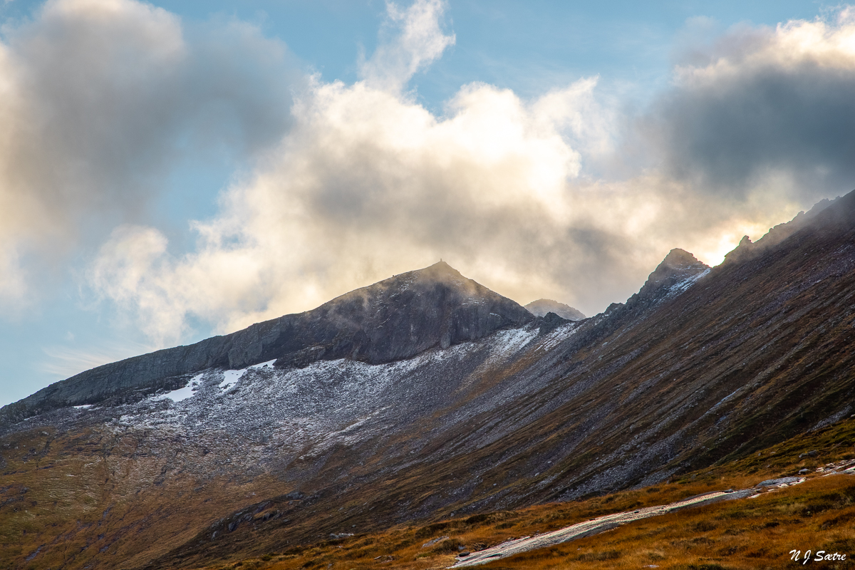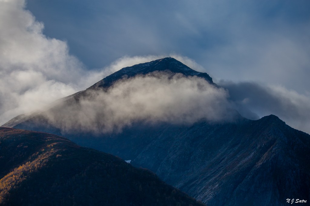 Men nå handlet det om bildet fra toppen. Jeg ble grådig, for tenk om solnedgangen ble magisk med skyer som ble farget rød. Det betydde at skodda måtte bort til jeg ankom toppen. Jeg forsto at jeg gamblet, men i det minste fikk jeg meg en fjelltur. Vel fremme ved kraftstasjonen, der jeg skulle sett fra meg sykkelen, møtte jeg en turgruppe. Og da kom det som jeg ikke ville høre.