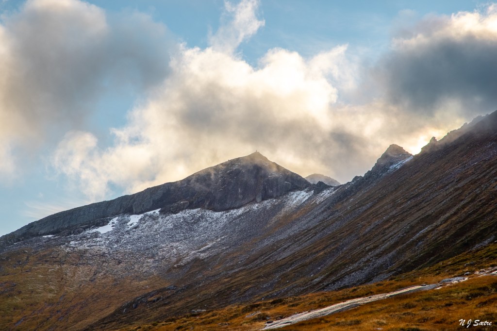 Skulle jeg snu? Vel, jeg gjorde det. Men kun 180 grader. Noe man bør gjøre oftere i fjellet, for da fikk jeg se at toppen av Saudehornet lå så vidt over skodda. Jeg ventet. Det var jo ingen grunn til å stresse til toppen, for Bergehornet slapp nok ikke ut av kjærlighetsgrepet med det aller første.