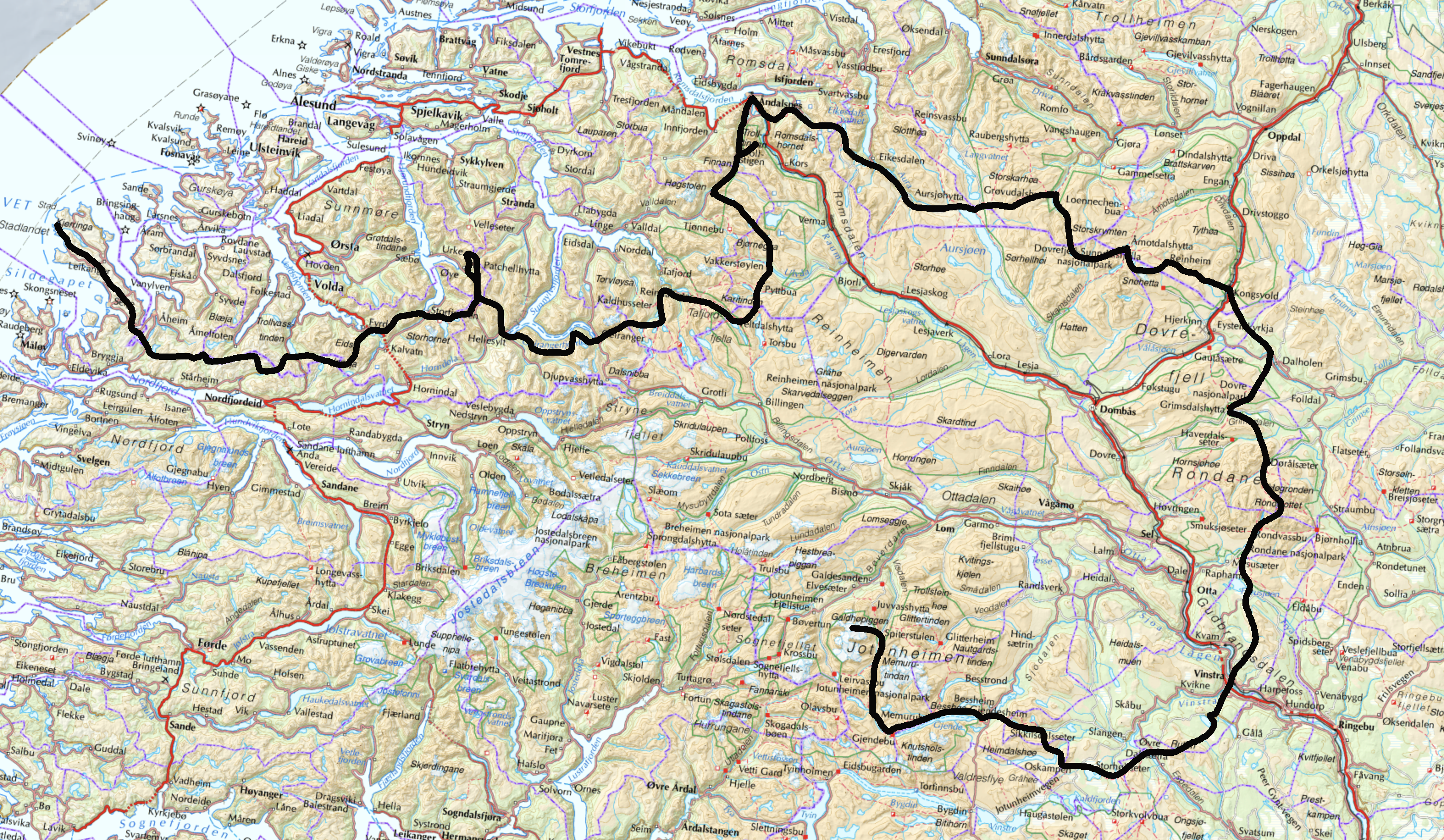 • Følge fjelltoppene i Vanylven/Nordfjord som utgjør fylkesgrensen mellom Møre og Romsdal og Vestland store deler av veien inn mot Bjørkedalen.